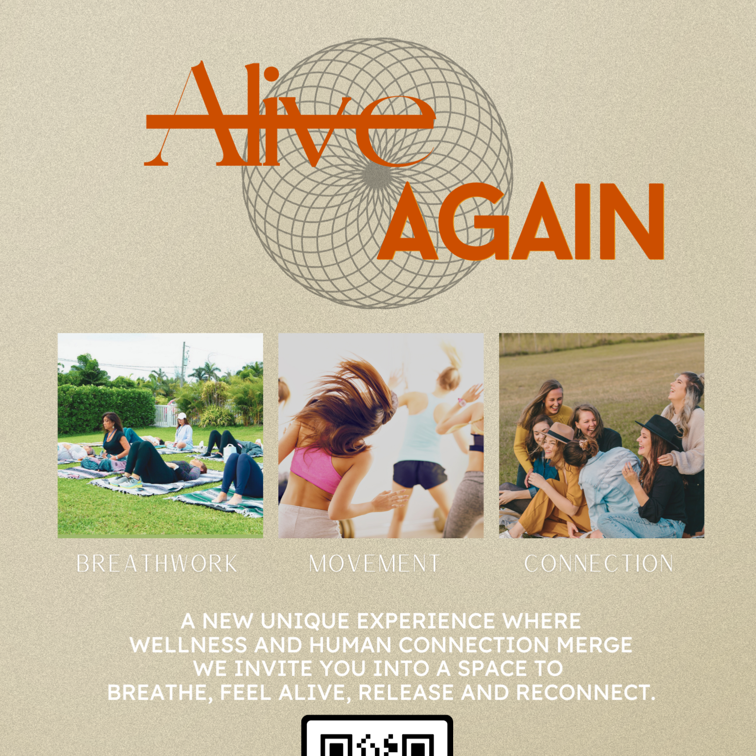 ALIVE AGAIN is a high-vibe, embodied experience designed to wake up your body, reset your nervous system, and reconnect you back to yourself through breath, movement, music, and collective energy with LIVE DJ.